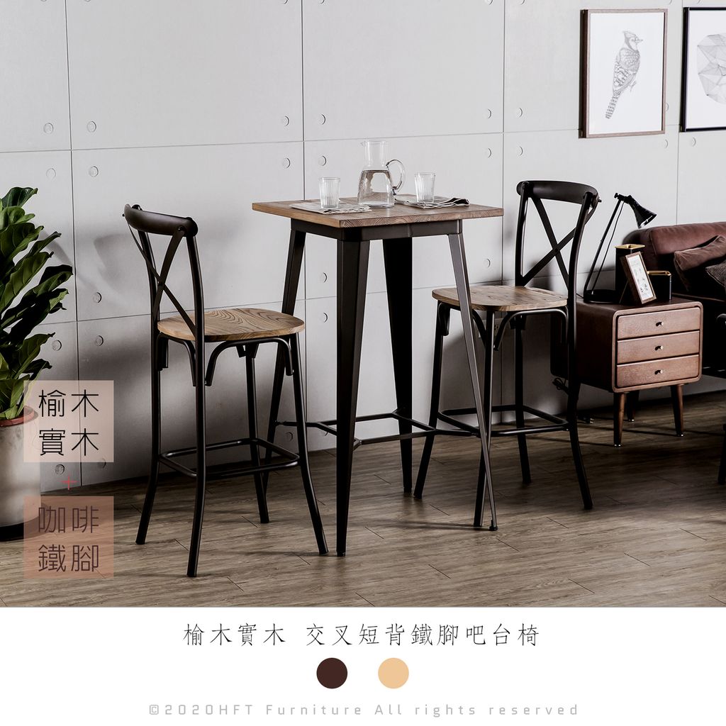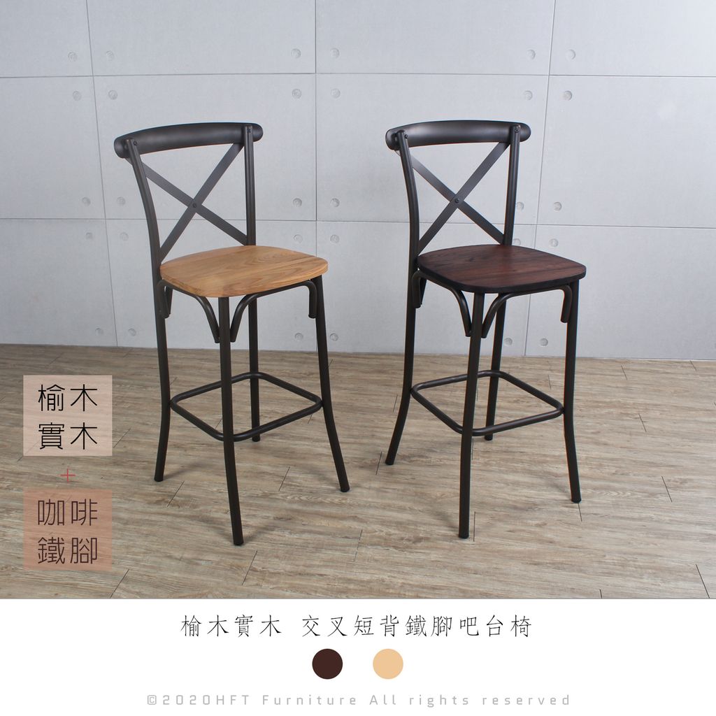 HFT-0062 榆木實木 交叉短背鐵腳吧椅 深咖色/原木色