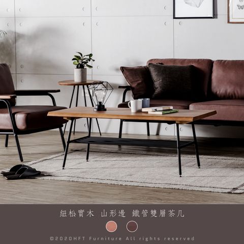 日系復古 紐松實木 仿自然山形邊 鐵管雙層收納茶几 柚木/胡桃色