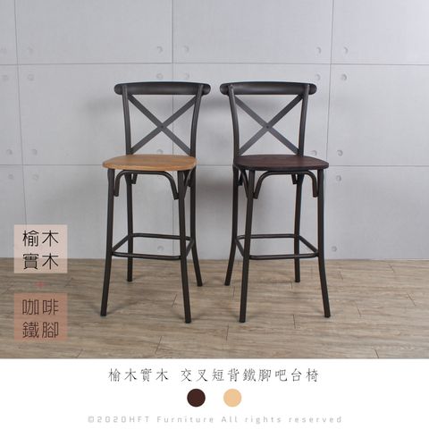 HFT-0062 榆木實木 交叉短背鐵腳吧椅 深咖色/原木色